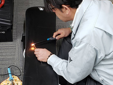 | サービス内容 | 新品のスノーボードを購入した場合、ケバ取りや滑走ワックスを浸透しやすくするために行います。シーズン開始、終了時のソールクリーニングのために行います。工程=アイロン→スクーレピング→ブラッシングマシン | 高フッ素配合のワックスをゲレンデと時期の雪温に合わせて複数スペシャルブレンドして行います。工程=アイロン→スクーレピング→ブラッシングマシン | 石や岩で滑走面やエッジの破損のリペアを行います。※現在提携工場にておこなっておりますので2~3週間いただきます。 |